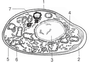 Іл. 3. Будова грибної клітини: 1 – клітинна стінка, 2 – плазматична мембрана, 3 – ядро, 4 – апарат Ґольджі, 5 – ендоплазматична сітка, 6 – рибосома, 7 – мітохондрія.